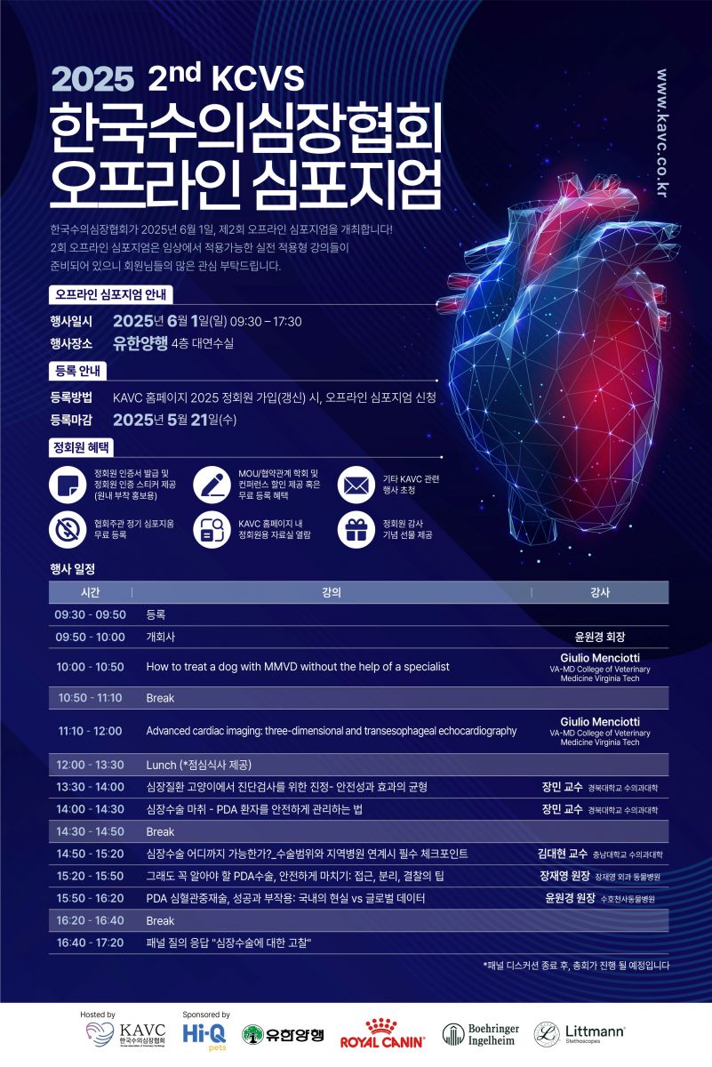 다가오는 6월 1일 일요일, 수의심장학 전문가들이 한자리에 모이는 제2회 Korean Veterinary Cardiology Symposium이 개최됩니다.